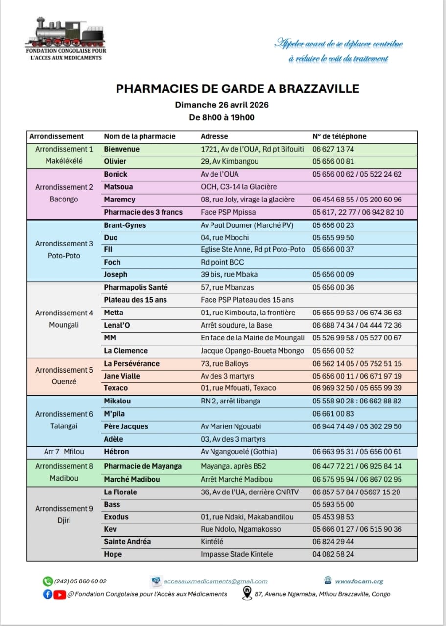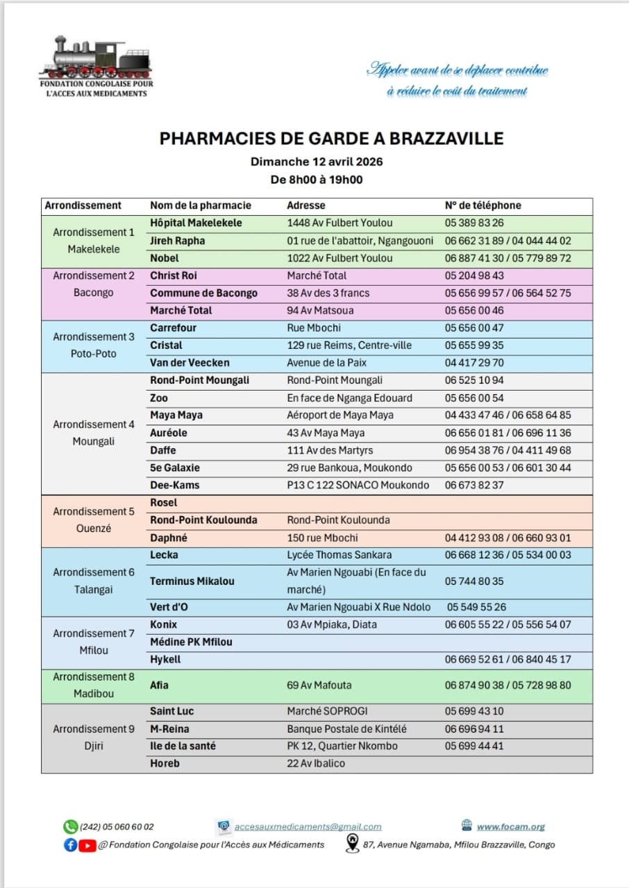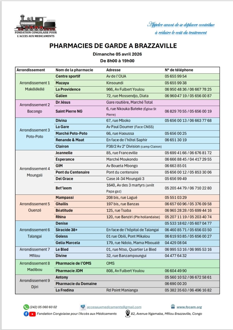 Calendrier des pharmacies de nuit Télécharger le calendrier Partager WhatsApp Facebook X (Twitter) Email Copier le lienCopié ✓ Dimanche 05 avril 2026 Télécharger le calendrier Partager WhatsApp Facebook X (Twitter) Email Copier le lienCopié ✓ Dimanche 12 avril 2026 Télécharger le calendrier Partager WhatsApp Facebook X (Twitter) Email Copier le lienCopié ✓ Dimanche 19 avril 2026 Télécharger le calendrier Partager WhatsApp Facebook X (Twitter) Email Copier le lienCopié ✓ Dimanche 26 avril 2026 Télécharger le calendrier Partager WhatsApp Facebook X (Twitter) Email Copier le lienCopié ✓ Nous Contacter Pour plus d’informations contactez-nous via nos réseaux officiels ou via notre formulaire de contact. Facebook Whatsapp Youtube Envelope Formulaire de ContactNomPrénomEmailTéléphoneObjet du message Votre message Envoyer